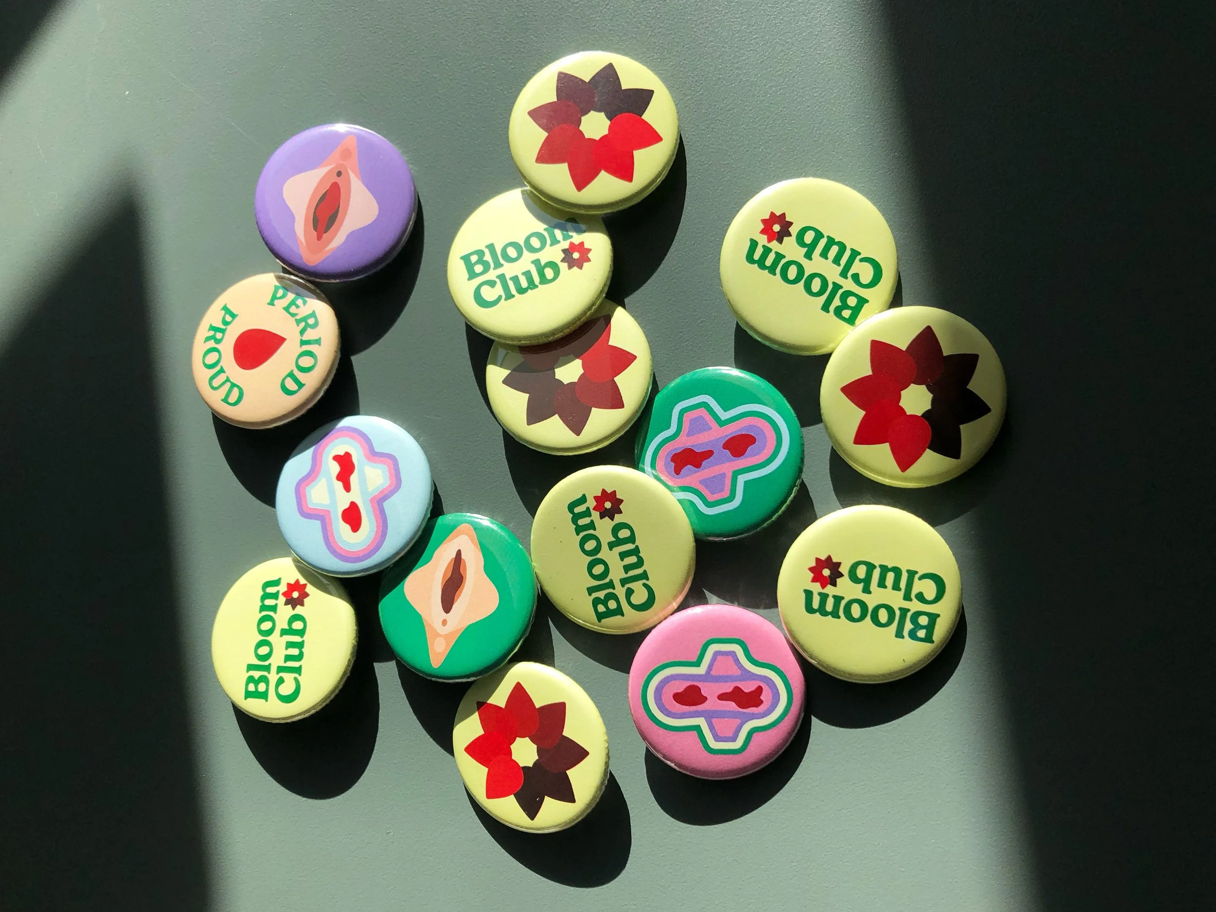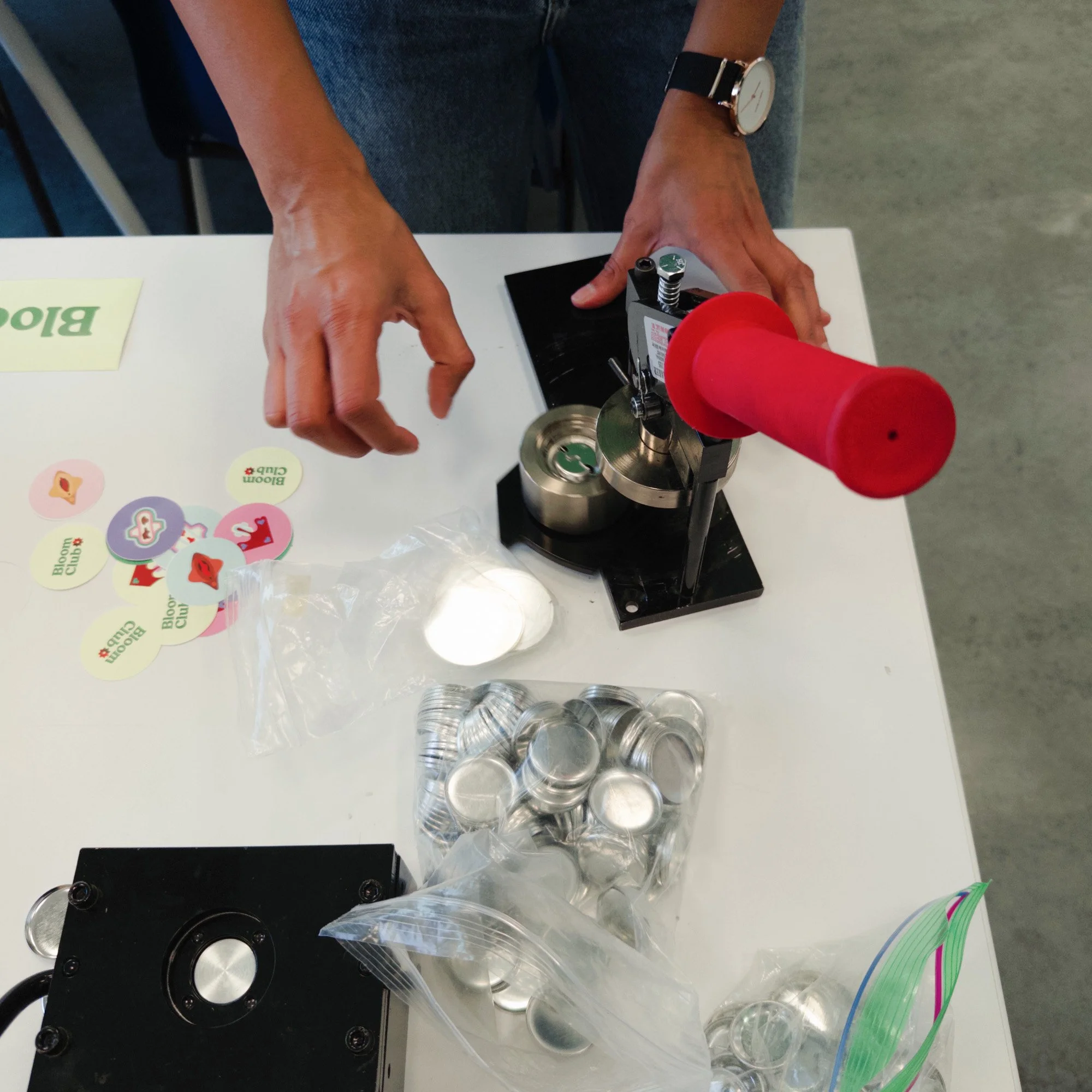 The event is supplied with snacks and refreshments for participants and facilitators. At the end of the session, participants leave with their created buttons and are handed out branded Bloom Club merchandise like stickers, pin buttons, and bookmarks.