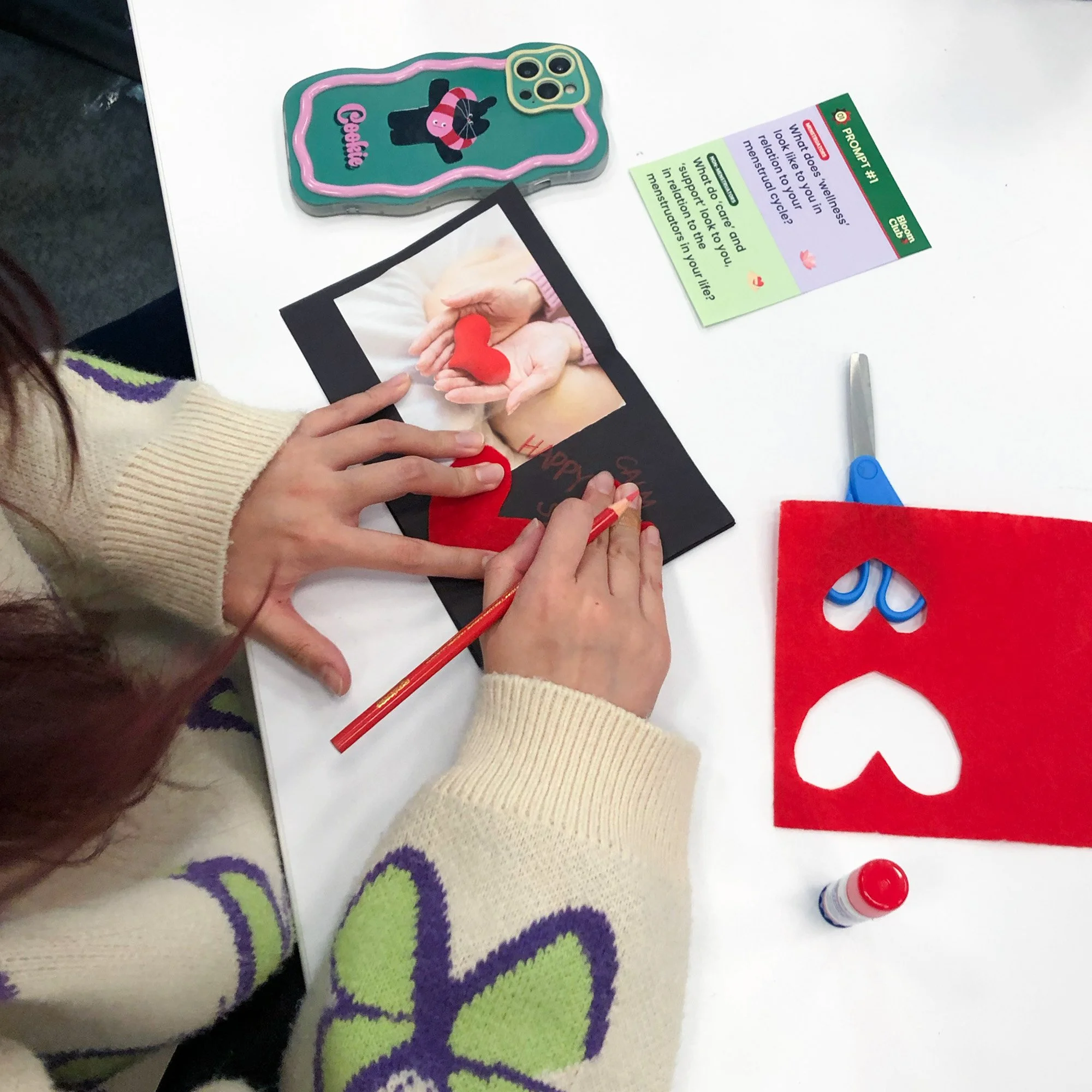 Structured similarly to the button-making workshop, participants receive activity cards with dual prompts catering to both menstruators and non-menstruators. The prompts encourage menstruators to visualise “wellness” in the context of their menstrual cycles and prompt non-menstruators to imagine what “care” and “support” should be for menstruators in their lives. The reverse side of the card invites menstruators to visualise their significant challenges in achieving menstrual wellness, while non-menstruators are prompted to envision their primary hurdles in providing better care and support to menstruators. These prompts aim to elicit participants’ visualisations of their responses to the questions, utilising visuals as a medium to capture nuanced experiences that might not be as effectively conveyed through words alone.