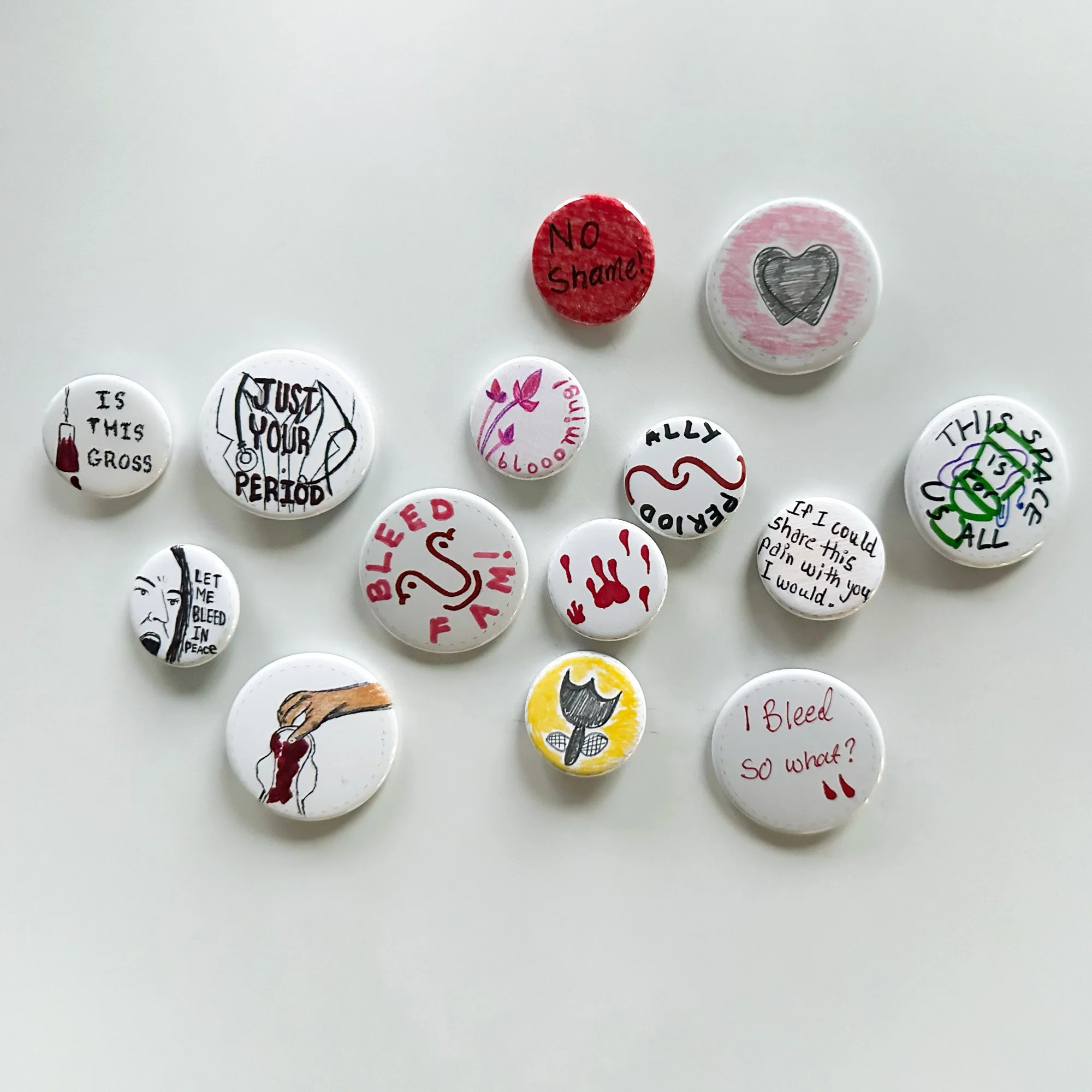 This workshop aims to provide a low-fidelity engagement activity for participants to express their thoughts and feelings about menstruation through the hands-on act of designing and making pin badge buttons.